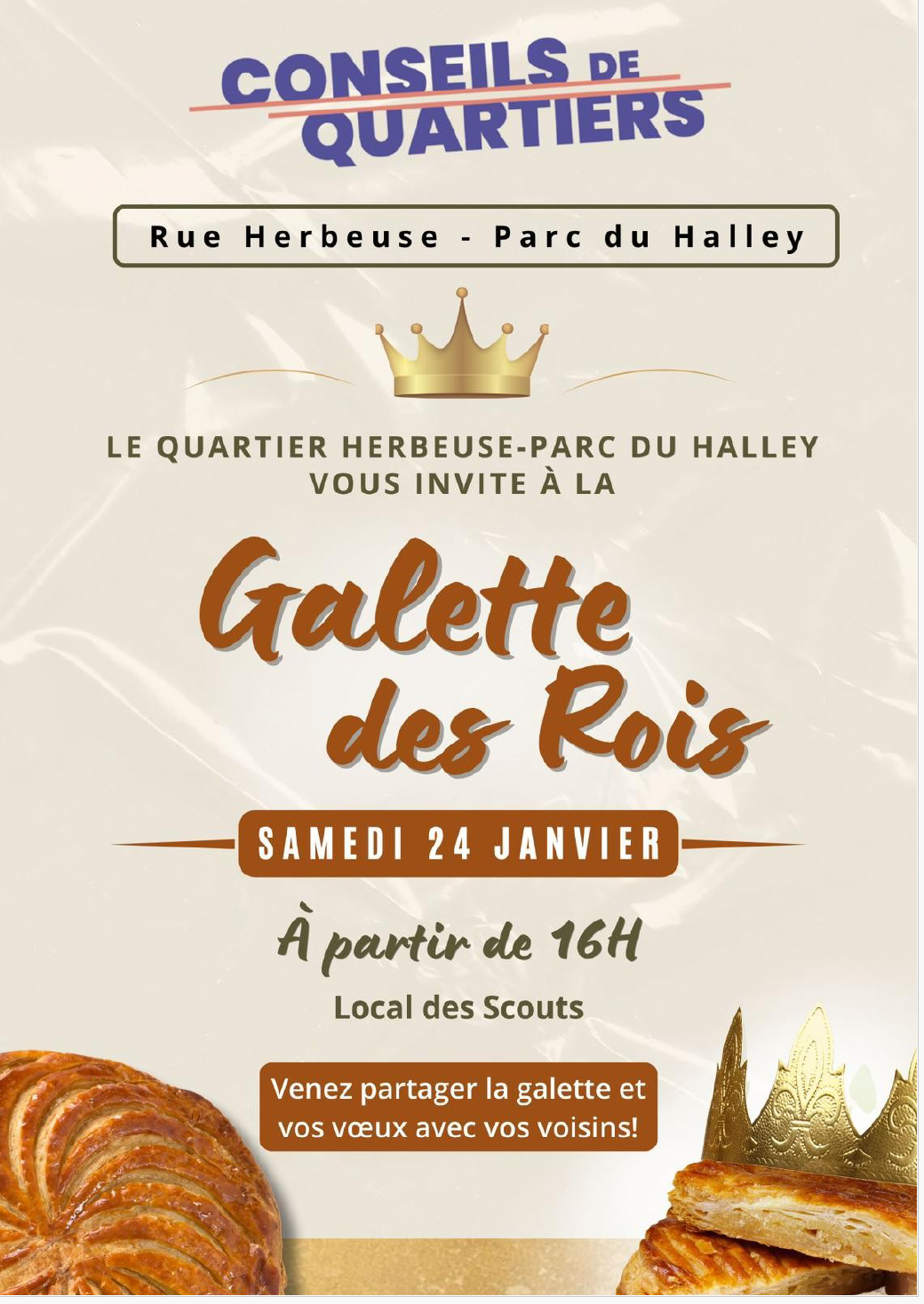Le conseil de quartier vous invite à échanger autour de la galette des rois dans notre salle habituelle (local des scouts) le samedi 24 janvier à 16h00.