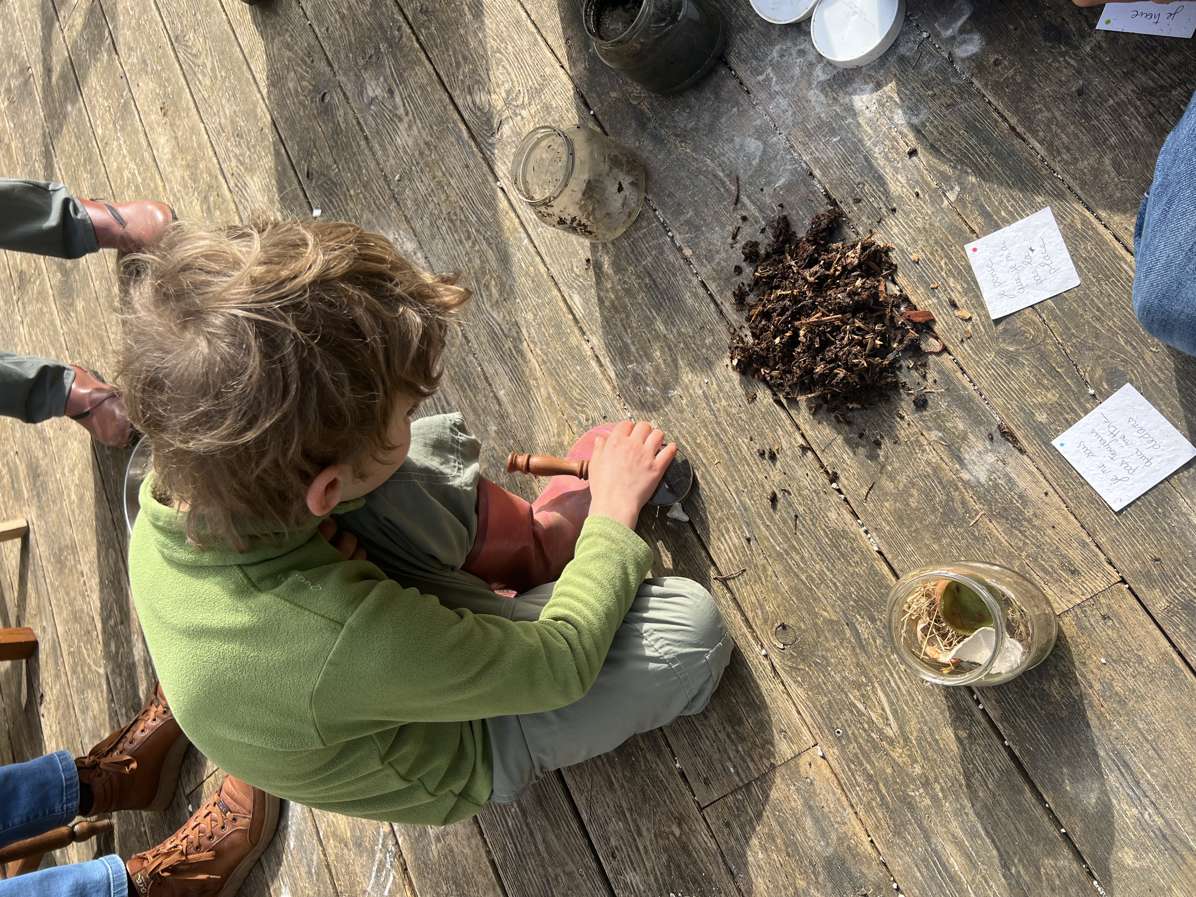 Nous avons également découvert le fonctionnement d’un composteur : quels apports y déposer (matières vertes et matières brunes), dans quelles conditions le compost se forme, et comment les petites bêtes — vers, insectes et micro-organismes — interviennent à différents moments pour transformer la matière en un amendement naturel précieux.